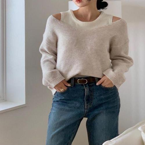 [옷자락] 여성 긴팔 니트 레이어드 트임 브이넥 루즈핏