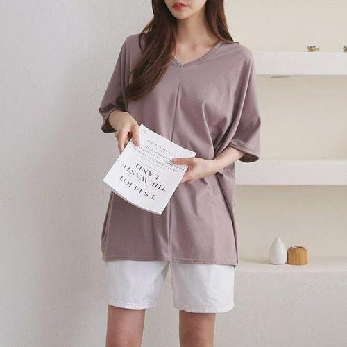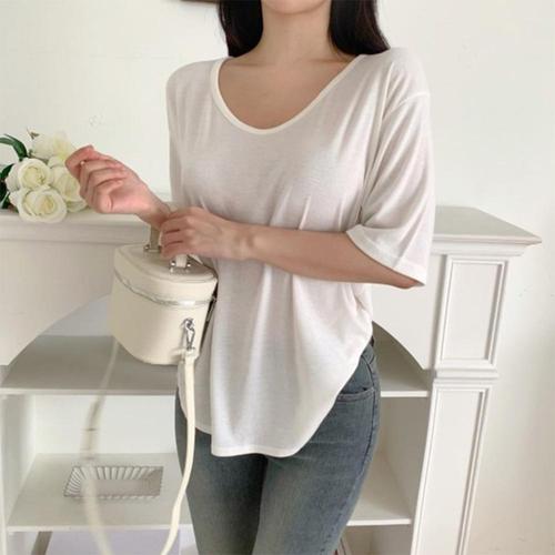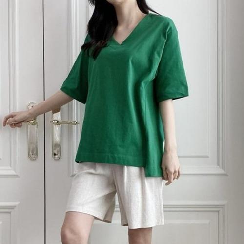 [옷자락]여성 루즈핏 브이넥 스판 반팔 티셔츠