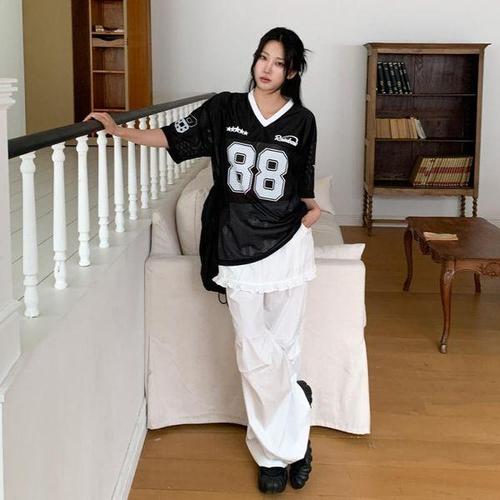 [옷자락]여성 나일론 메쉬 루즈핏 브이넥 반팔티