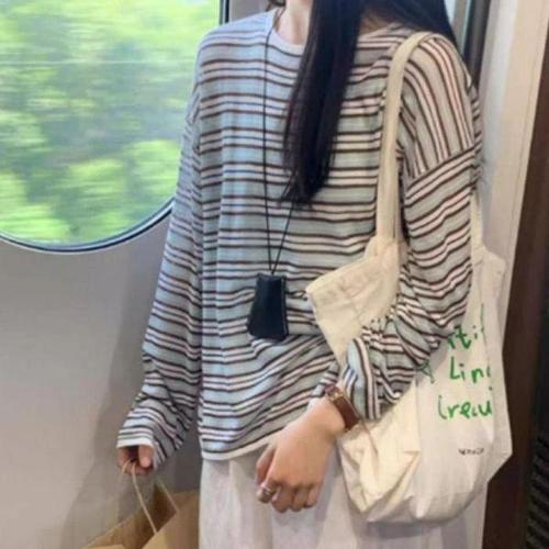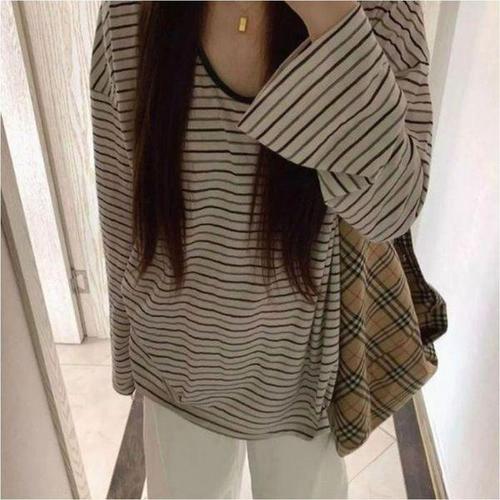 [엄지척]여자 오버핏 스타일 레트로 줄무늬 긴팔티 고품질 꾸_19645757_667501