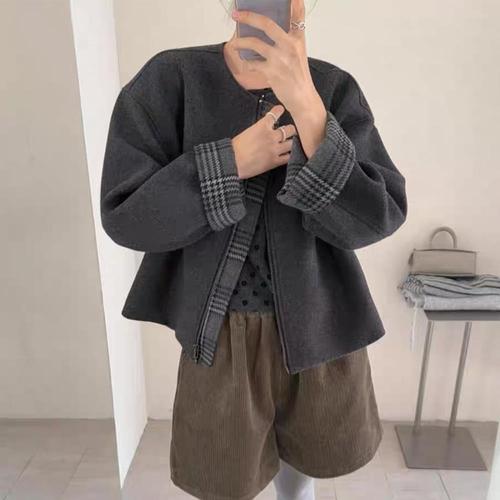 [옷자락]여성 울혼방 체크 노카라 오버핏 집업 자켓