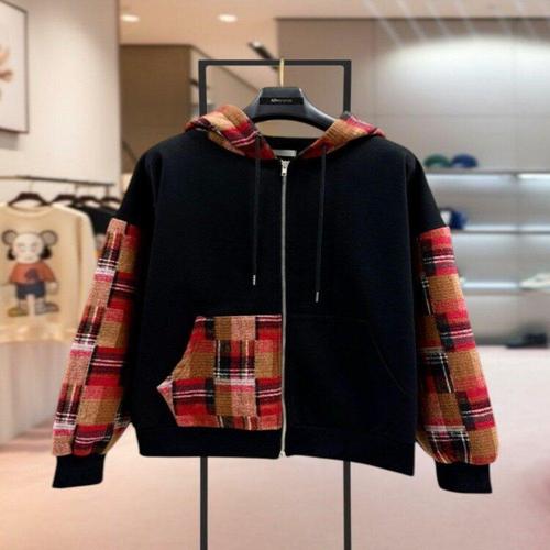 [하프클럽/]여성 체크 배색 후드 루즈핏 간절기 자켓 점퍼