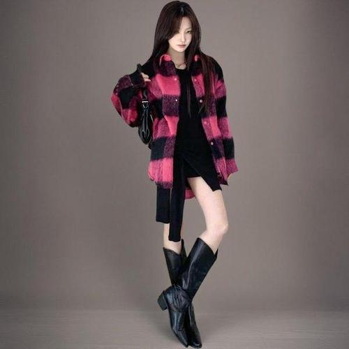 [신상오픈런]여성 루즈핏 체크 패턴 퍼 자켓