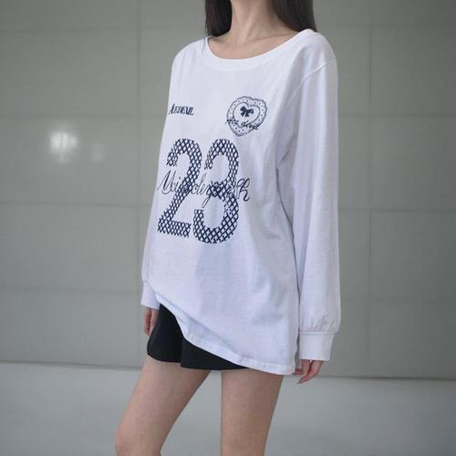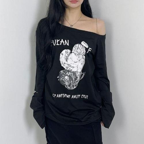 [옷자락]여성 레터링 면 원오프숄더 루즈핏 긴팔티셔츠