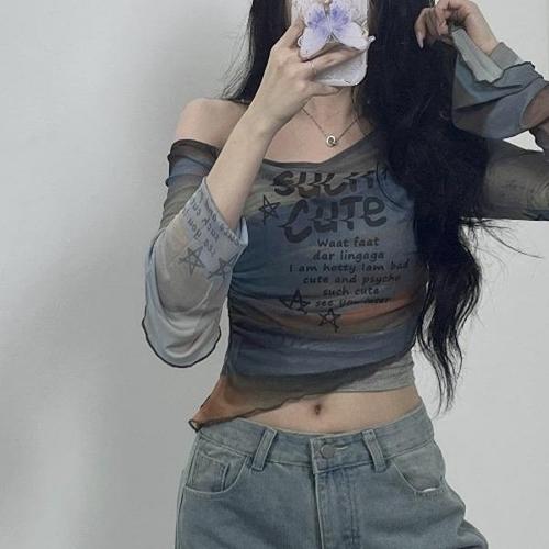 [엄지척]그래피티 메쉬 시스루 오프숄더 언발 크롭티_19598967_667501