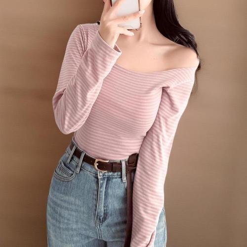 [미라클세븐]여성용 스트라이프 오프숄더 긴팔 티셔츠 레이온 스판