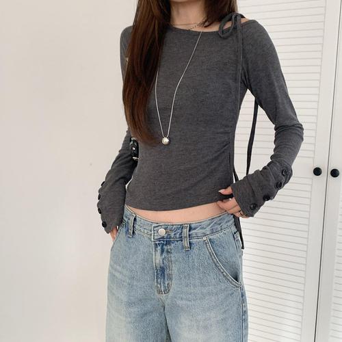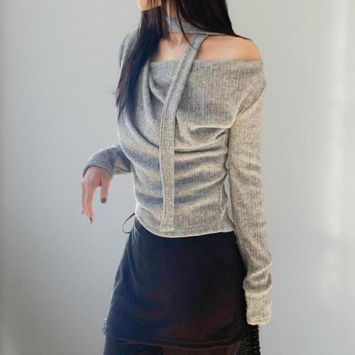 |KMT9FC5|여성 봄가을 오프숄더 홀터넥 슬림핏 니트 골지 티셔츠