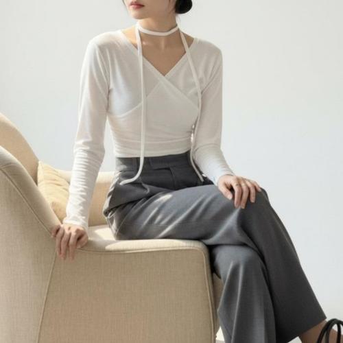 |KHTA084|여성 랩형 오프숄더 긴팔 세미 크롭 니트 티셔츠
