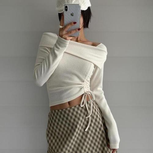 옷자락 / 여자 옆셔링 오프숄더 롱슬리브 슬림핏 골지 티셔츠
