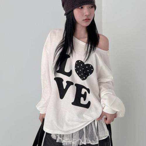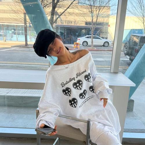 [신상오픈런]여성 하트 프린트 오프숄더 긴팔 티셔츠 루즈핏 봄 맨투맨 (45899562)