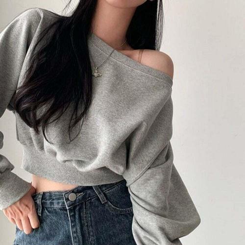 [신상오픈런]여성 오프숄더 무채색 크롭 슬림핏 봄 맨투맨 (45899565)