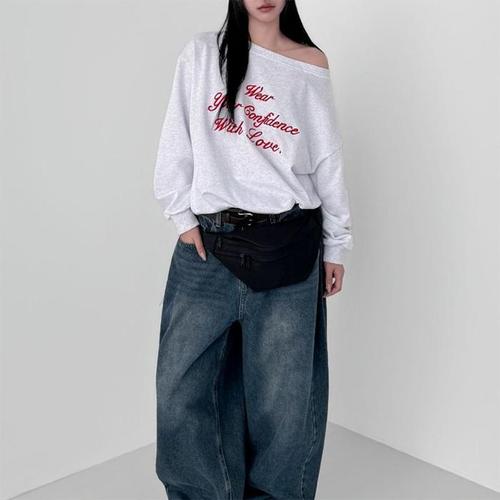 [옷자락]여성 자수 글씨 오프숄더 배색 루즈핏 봄 맨투맨