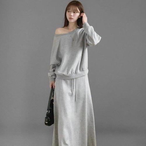 [옷자락] 여자 루즈핏 오프숄더 맨투맨 트임 롱 스커트 세트