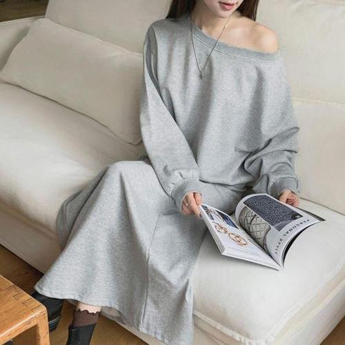 [신상오픈런]여성 루즈핏 오프숄더 맨투맨과 트임 롱스커트 세트