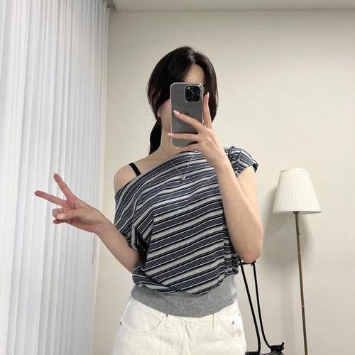 [옷자락] 여자 원숄더 오프숄더 스트라이프 맨투맨 티셔츠