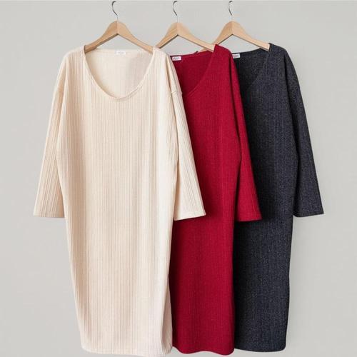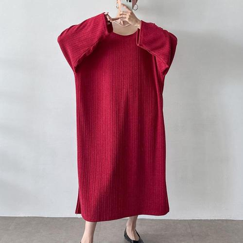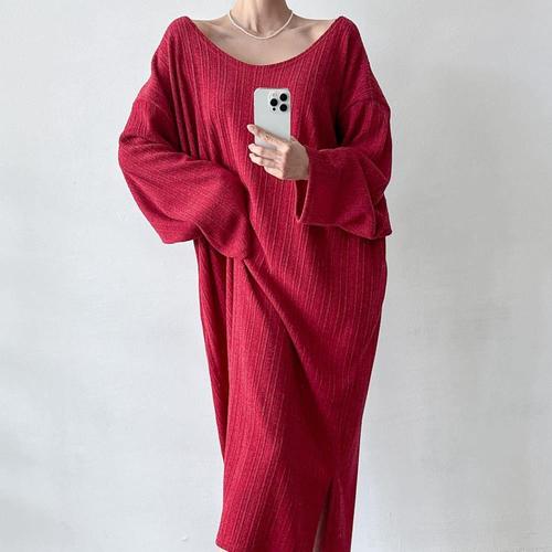 [미라클세븐]빨간색 롱원피스 여성용 오프숄더 빅사이즈 골지 디자인 밑트임