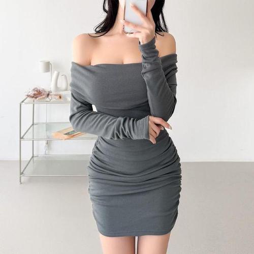 [옷자락] 여자 무지컬러 셔링 기모 오프숄더 미니 원피스