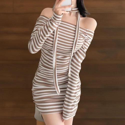 여자 스트라이프 셔링 오프숄더 미니 원피스