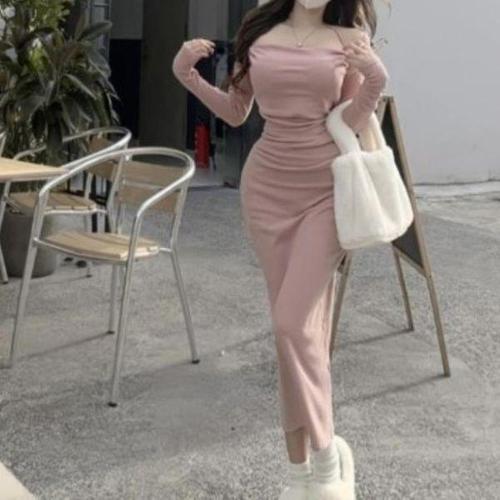 [옷자락]여성 오프숄더 스트랩 슬림 원피스 볼륨 셔링 롱드레스