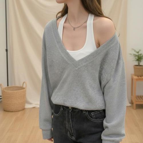 [셀러허브_여성트랜드패션]여성 트렌디 오프숄더 브이넥 루즈 크롭 맨투맨