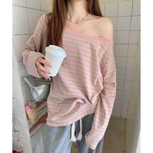 [셀러허브_여성트랜드패션]Rly 단가라 스트라이프 여성 긴팔 티셔츠 오프숄더 V