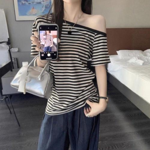 [오너클랜]인기상품 여성용 오프숄더 스트라이프 반팔 티셔츠 여름 캐주얼웨어 [WFLLARH_260304]
