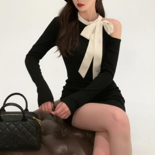[신상오픈런]여성 오프숄더 리본 장식 연말 파티 원피스 (46120238)