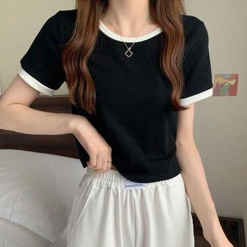 [셀러허브_여성트랜드패션]Rly 소매 네크라인 배색 반팔 무지 크롭 반팔 티셔츠