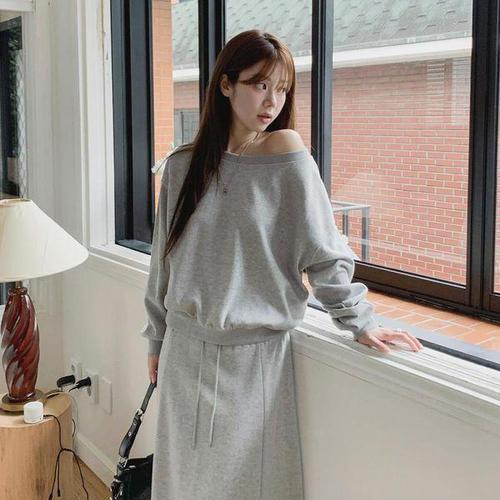 [옷자락] 여자 루즈핏 오프숄더 맨투맨 트임 롱 스커트 세트