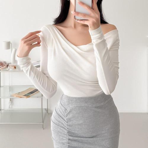 [옷자락]여자 무지컬러 드레이프 찰랑핏 오프숄더 긴팔티