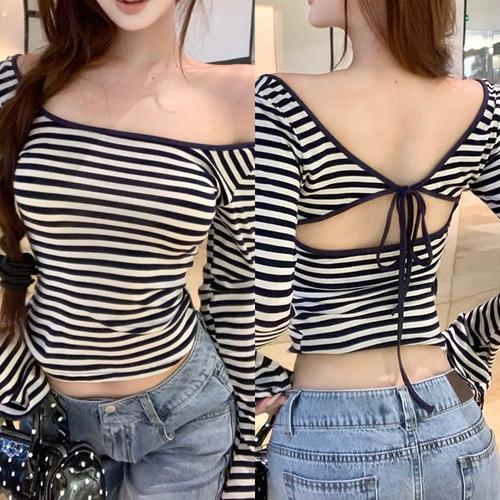 [옷자락]여성 러블리 백리본 트임 오프숄더 단가라 숏 긴팔티