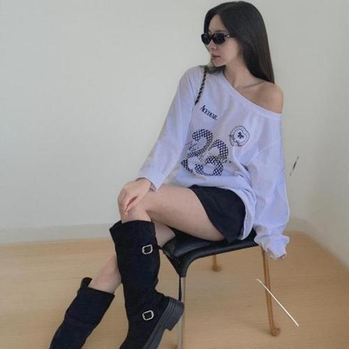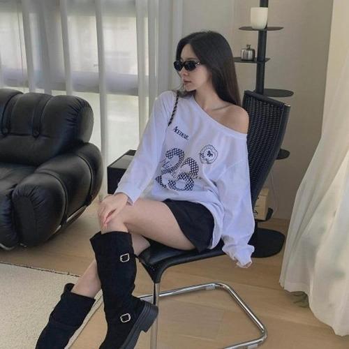 [다잇템][다잇템] 여자 빅사이즈 필기체 원오프숄더 면원단 긴팔티_23358725_588872