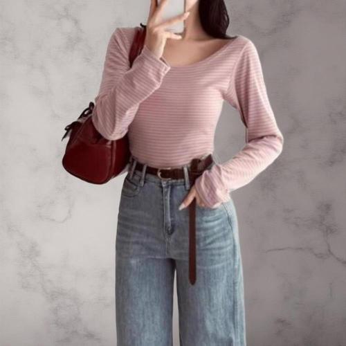 [옷자락]여성 레이온 스판 줄무늬 오프숄더 긴팔 티셔츠