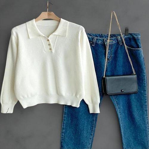 [옷자락]여성 스냅 버튼 오픈 카라 넥 루즈핏 긴팔 니트