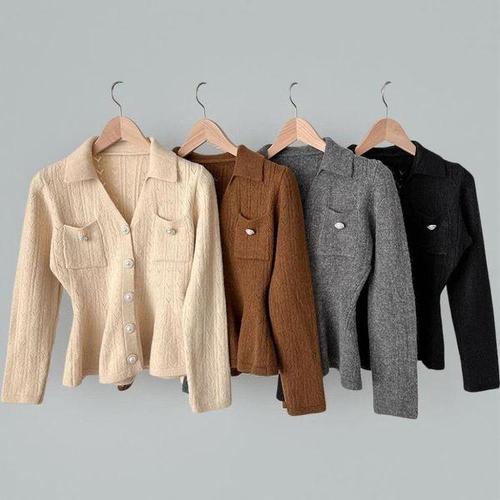 [신상오픈런]여성 스카시 카라넥 니트 포켓 진주 버튼 페플럼 가디건