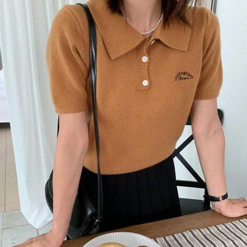 [신상오픈런]여성 캐주얼 자수 레터링 버튼 카라 반팔 니트