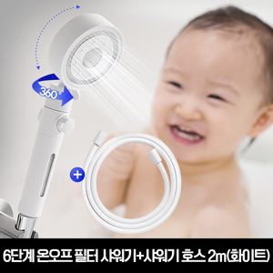 온가족이 쓰는 올인원 6단계 온오프 필터 샤워기+물때방지 PVC 샤워기 호스 2m(화이트)