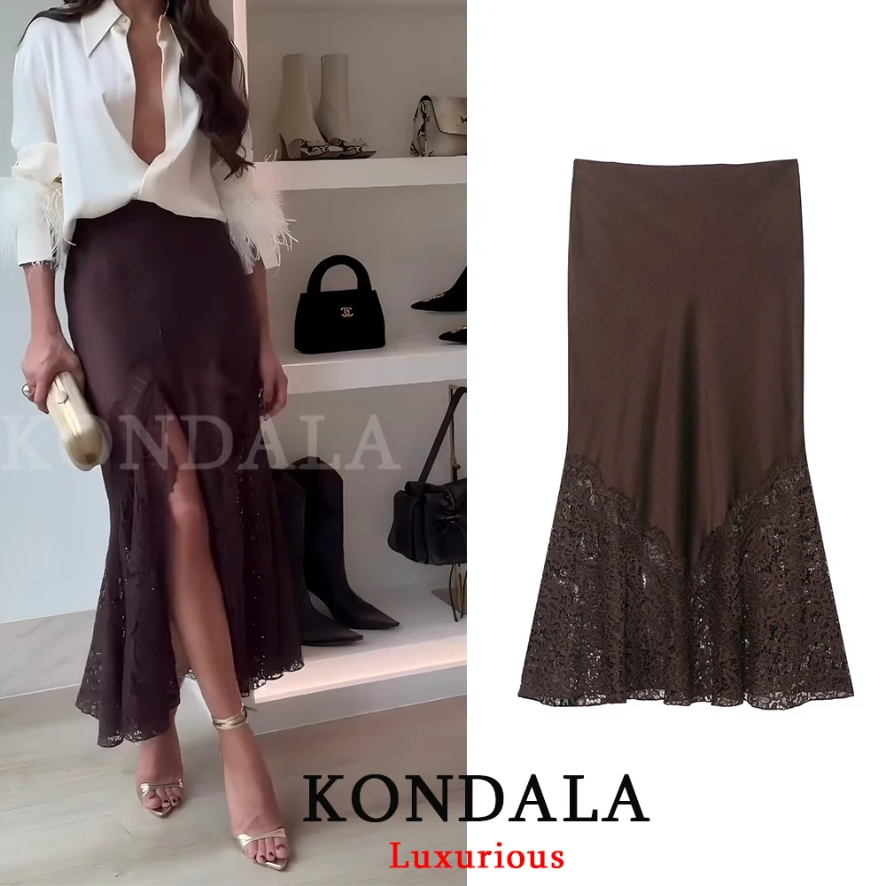 여성 스커트 패션 레이스 장식 새틴 미디 스커트 빈티지 여성 하이웨이스트 롱 스커트