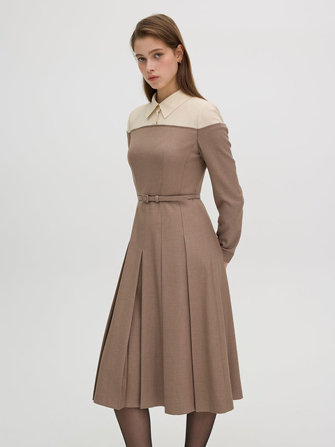 [올리브데올리브]OW5MO459_셔츠 카라 배색 플레어 미디 원피스