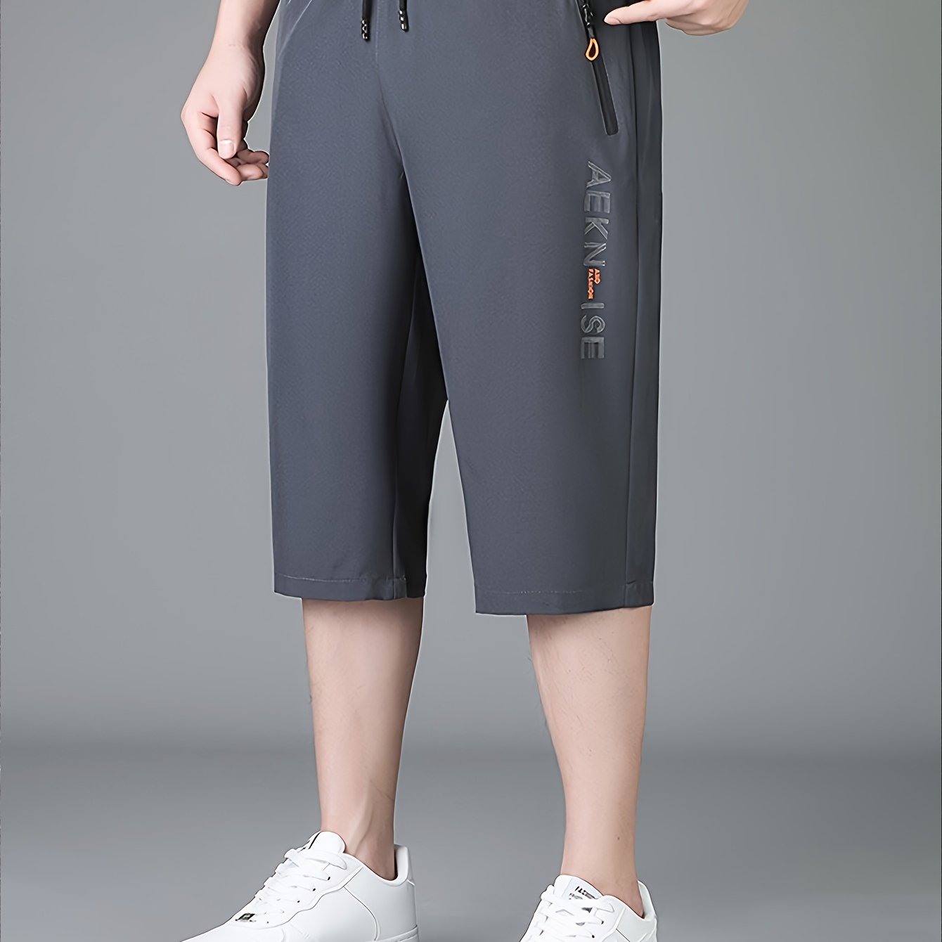 TEMU 남성용 캐주얼 스포츠 카프리 팬츠, 통기성 좋은 속건성 디자인, 지퍼 포켓, 드로스트링 허리 밴드, 레터 프린트, 야외 활동 및 일상복에 적합
