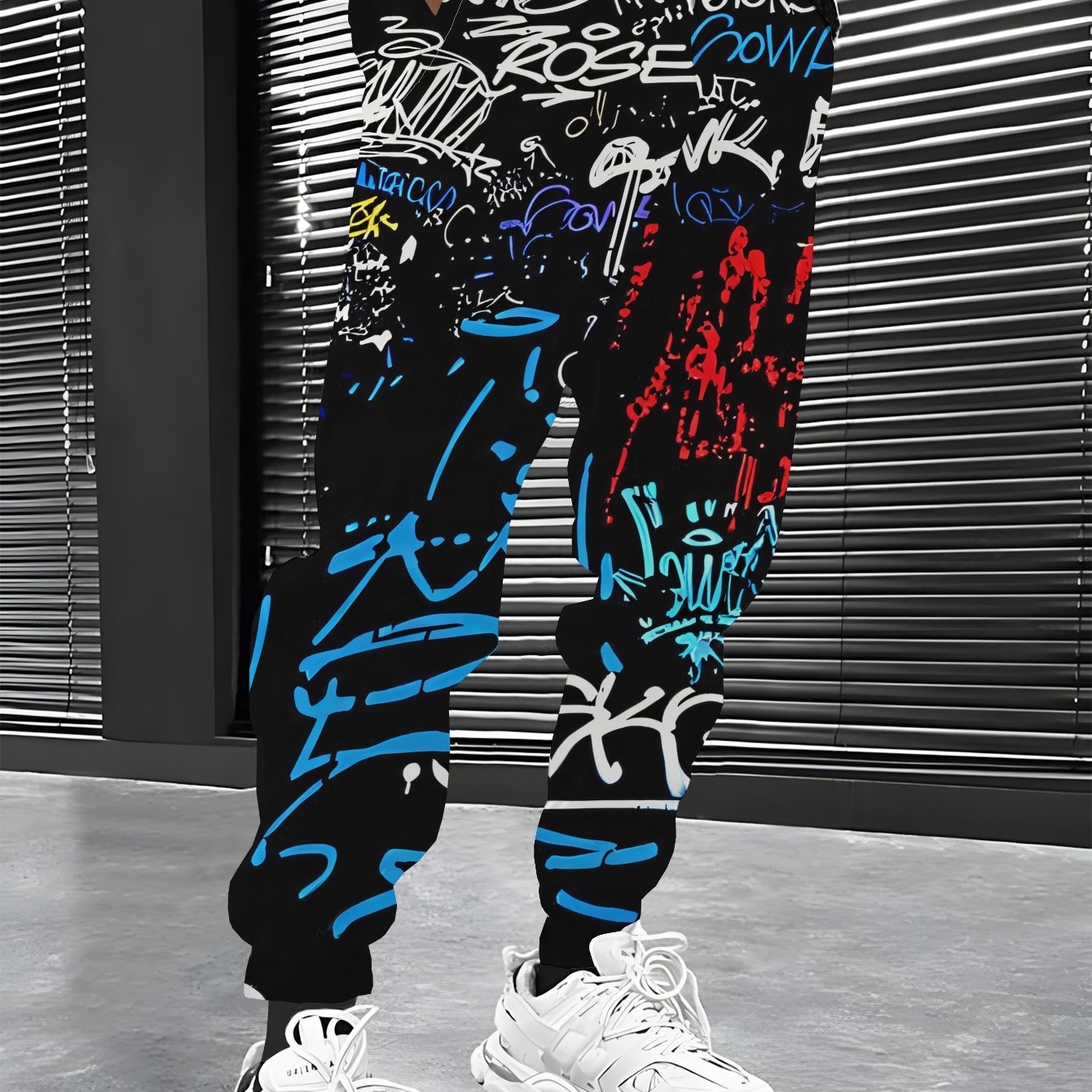 TEMU 남성 트렌디 캐주얼 긴 바지. 검은 배경에 라인과 텍스트가 채워져 강력한 예술적 분위기를 연출합니다. 전체 프린트 디자인은 유니크한 스타일을 쉽게 연출하며 다양한 스타일에 적합합니다.