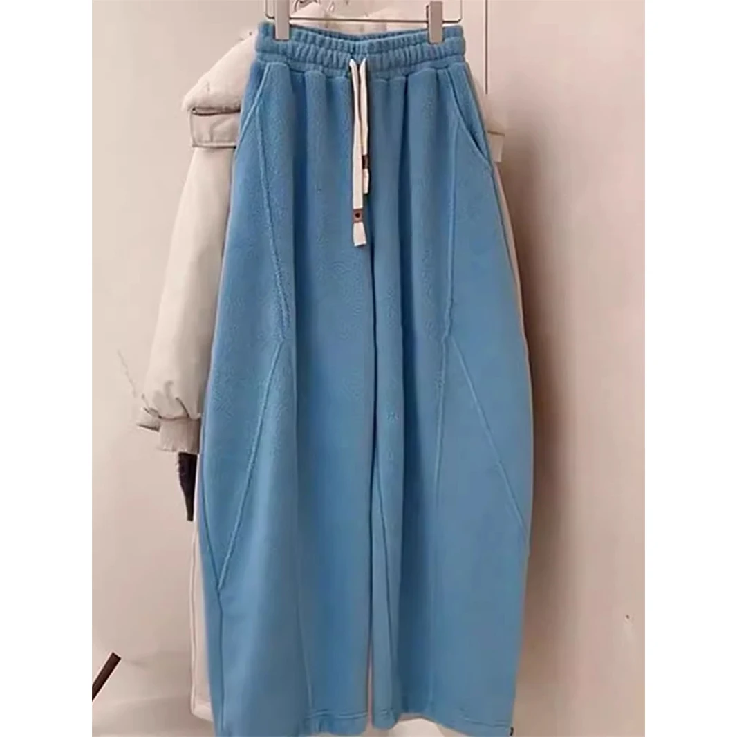 TEMU 여성용 한국풍 겨울 보온 와이드 레그 팬츠 - 풀 기장 플리스 느낌 아우터웨어 팬츠, 포켓 포함, 핏 (없음), 따뜻함 / 한국 스타일 캐주얼 웨어 (가을/겨울) - 드레스와 다양한 매치 가능|여성원피스|냉장고바지|바지