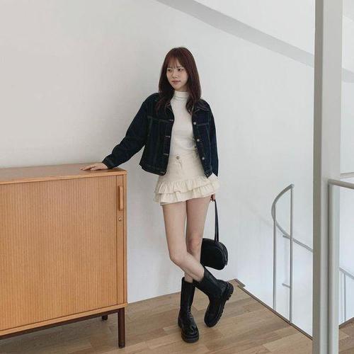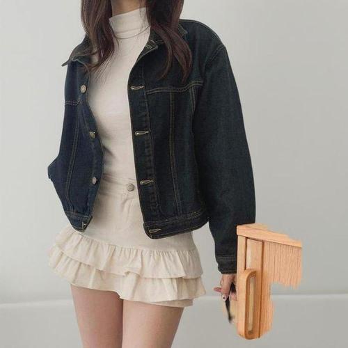[옷자락] 여성 키치무드 워싱 코튼 루즈핏 세미크롭 데님 자켓