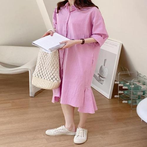 [다잇템]여자 분홍 후레아 워싱 남방 롱 마원단 원피스 (10419048A)
