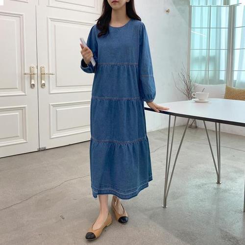 [다잇템]여자 중청 롱 면원단 U넥 진 티어드 원피스 (10954548A)