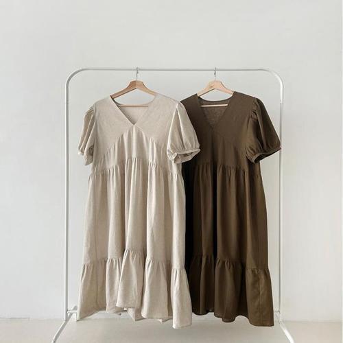 [다잇템]여자 SS 마원단 잔주름 V넥 티어드 원피스 (10447913A)
