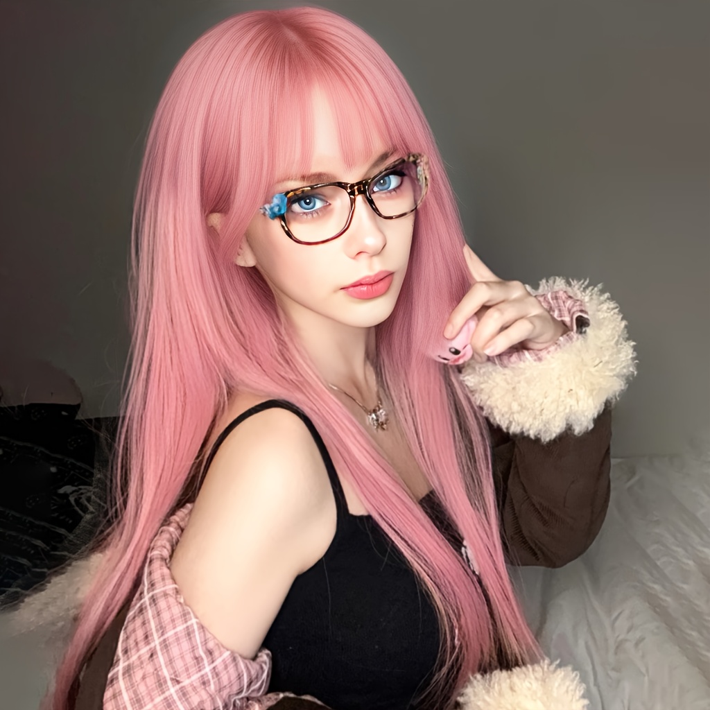TEMU 여성용 합성 가발 - 핑크 (파스텔에서 진한 톤까지) | 긴 헤어와 앞머리 | 자연스러운 볼륨감 & 풍성함 | 일상, 파티, 콘서트용 | 로즈 네트 캡으로 안전 고정 | 모든 연한 베이지 색상에 적합 | 경제적이고 우아한 스타일링, 페스티벌 액세서리, 세련된 프린지, 편안한 착용감, 패션 애호가에게 추천