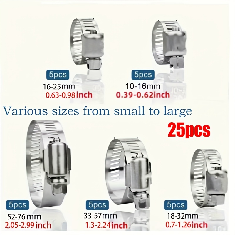 TEMU 다양한 사이즈의 스테인리스 스틸 호스 클램프 세트. 조절 가능한 스크류 기어 나선형 클램프가 특징이며, 25/64인치에서 2-3/4인치(10-76mm) 사이의 호스에 적합합니다. 자동차 연료 라인 및 배관 시스템에 이상적입니다.