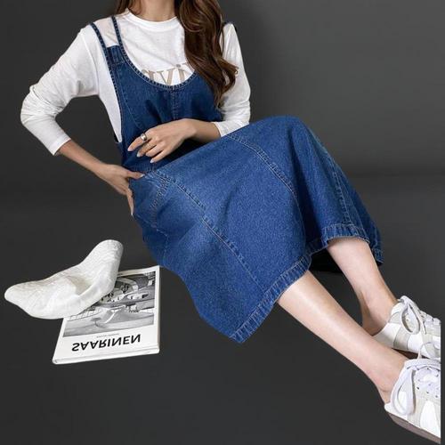[미라클세븐]여성 중청색 포켓 디테일 이중 스트랩 청멜빵 롱 드레스