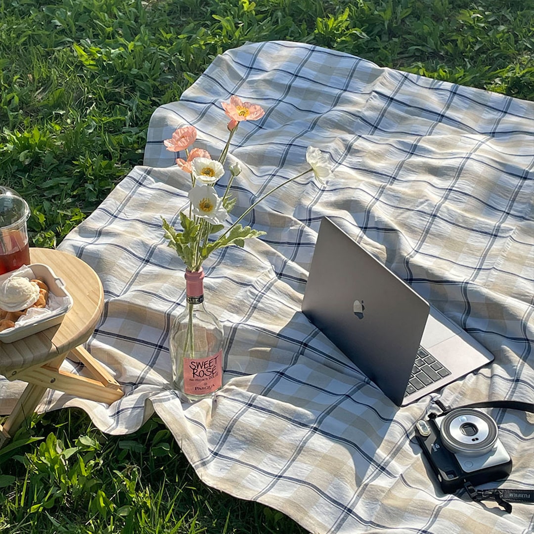 모던 린넨 체크 피크닉매트 감성 순면 단면방수 돗자리 3size
